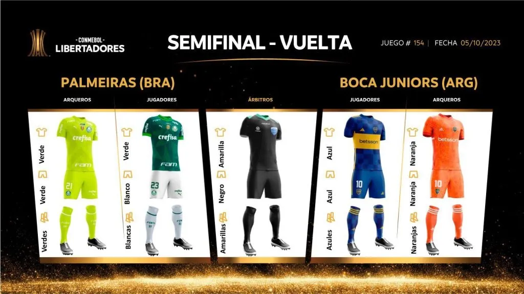 A falta de pocas horas para que Palmeiras y Boca definen al segundo finalista de la CONMEBOL Libertadores (21:30 por Star+), se confirmaron los uniformes que usarán los equipos.