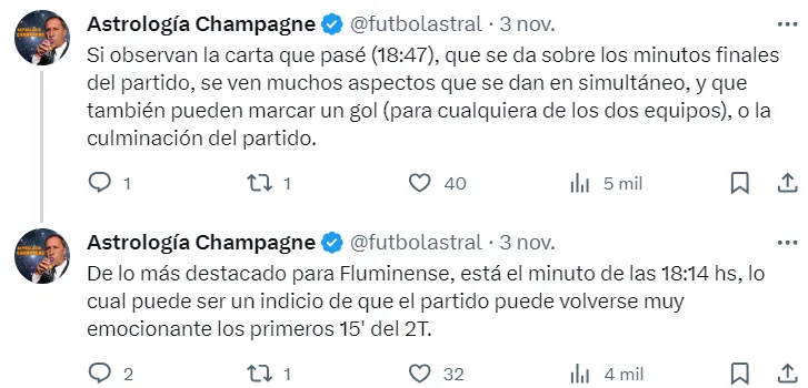 “De lo más destacado para Fluminense, está el minuto de las 18:14, lo cual puede ser un indicio de que el partido puede volverse muy emocionante los primeros 15′ del segundo tiempo”, advierte @futbolastral, que cuenta con más de 11 mil seguidores.