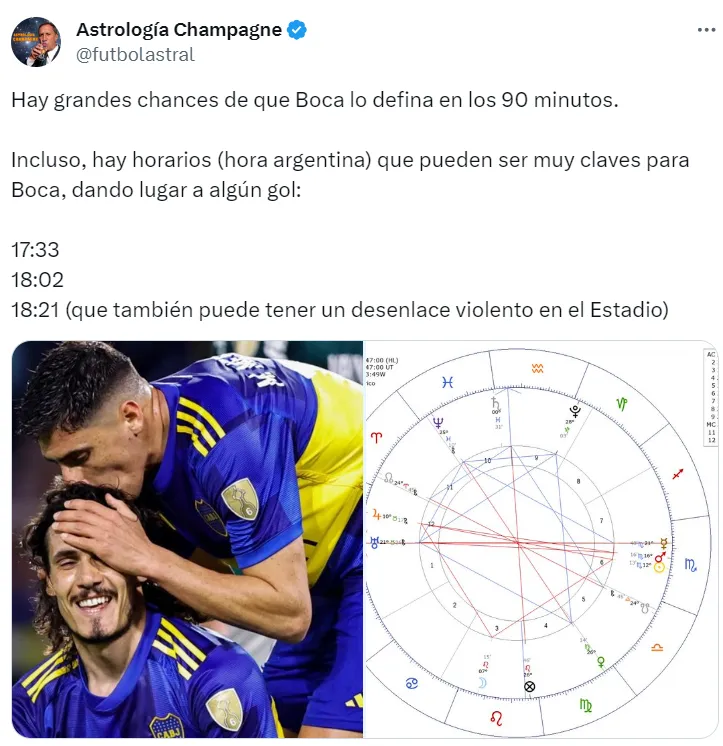 Boca va en busca de la séptima enfrentando a Fluminense en el Maracaná y, en pleno auge de las predicciones en el mundo del fútbol, apareció una muy precisa que también lo da como ganador. La cuenta de Twitter @futbolastral, soltó un análisis muy preciso sobre lo que sucederá esta tarde, incluyendo hasta los minutos en los que pueden llegar las emociones.