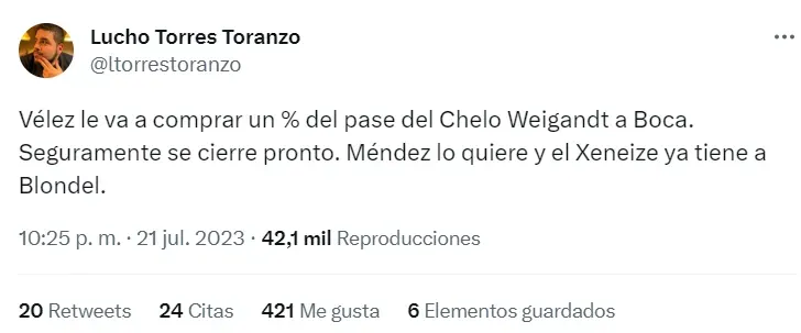 Así lo informó el periodista Lucho Torres Toranzo: “Vélez le va a comprar un % del pase del Chelo Weigandt a Boca. Seguramente se cierre pronto. Méndez lo quiere y el Xeneize ya tiene a Blondel”. Está todo dado para que el lateral derecho se vaya en las próximas horas.
