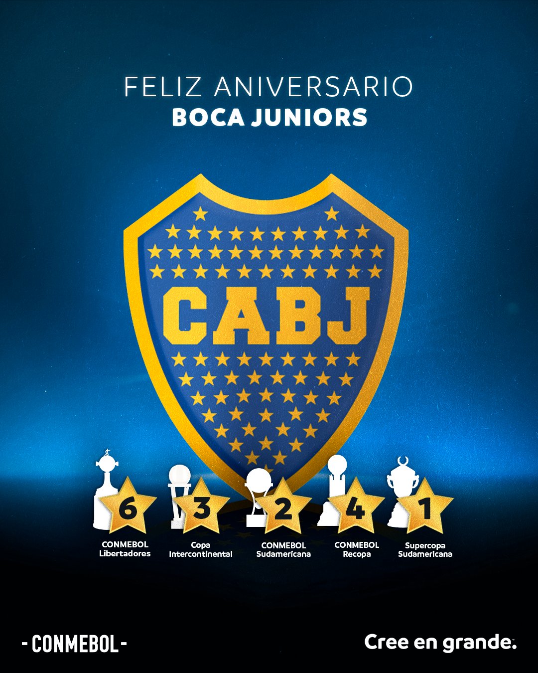 “Feliz aniversario, Boca“, escribió la cuenta oficial de la casa madre del fútbol sudamericano. El posteo incluía una gráfica contabilizando los logros del club a nivel continental, pero la suma de las estrellas daba 16, lejos de las 18 que se le reconocen oficialmente.