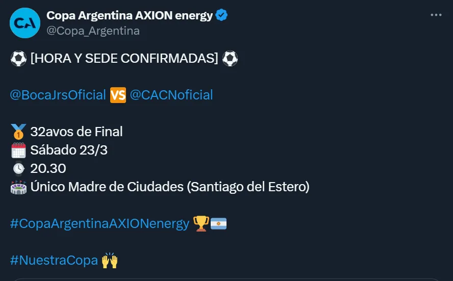 El cotejo será correspondiente a los 32avos de final, donde el Xeneize se medirá frente al Azabache el sábado 23 de marzo en la provincia de Santiago del Estero, mas precisamente en el estadio Madre de Ciudades. El árbitro dará el pitazo inicial a las 20:30 y ambas parcialidades podrán concurrir para alentar a sus respectivos equipos.