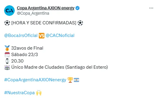 El encuentro entre Boca Juniors y Club Atlético Central Norte de Salta por la Copa Argentina 2024 ya tiene fecha confirmada: será el sábado 23 de marzo a partir de las 20:30 horas.