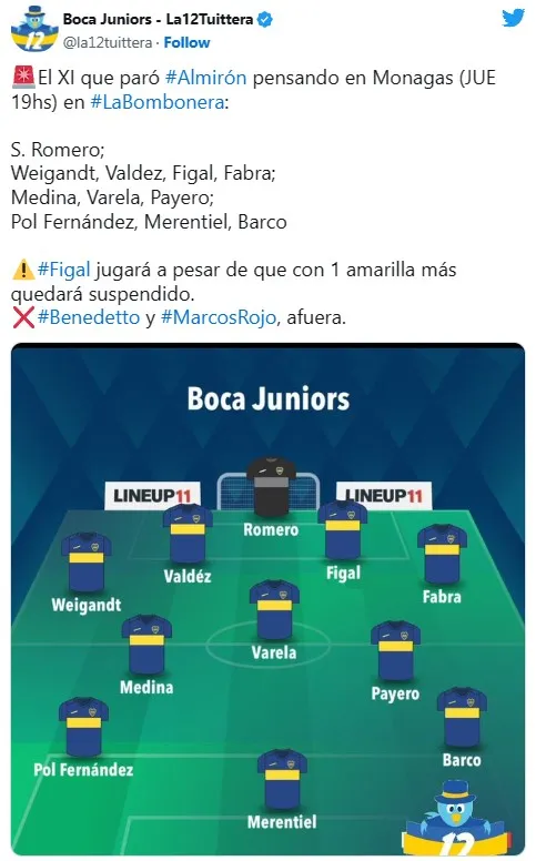La determinación del DT parece haberse dado tras confirmarse que Marcos Rojo no está en condiciones para hacer su retorno a las canchas contra Monagas. Almirón imaginaba al capitán compartiendo zaga con Bruno Valdez, pero fue descartado en las últimas horas. Es por eso que Nicolás Figal jugará la última fecha de la fase de grupos de la CONMEBOL Libertadores a sabiendas de que podría perderse el próximo compromiso de Boca en la Copa. A tener cuidado.