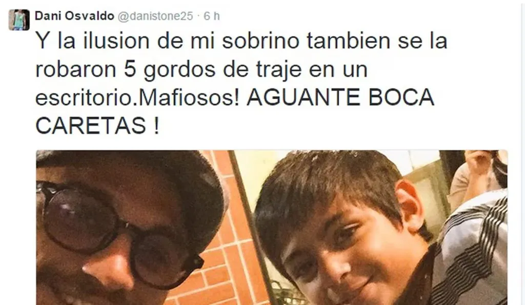 “Al final, los gordos de traje están todos indagados, fueron todos sopre… Bueno, sopre no porque esa gente no va sopre. Pero eran todos corruptos, al final fueron todos a los que les saltó la ficha”, aseguró para referirse a lo que ocurrió en aquella jornada en La Bombonera, además de que recordó el tuit de 2015 en donde sentenció: “Y la ilusión de mi sobrino también se la robaron cinco gordos de traje en un escritorio. ¡Mafiosos! ¡AGUANTE BOCA, CARETAS!”.