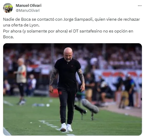 “Nadie de Boca se contactó con Jorge Sampaoli, quien viene de rechazar una oferta de Lyon. Por ahora (y solamente por ahora) el DT santafesino no es opción en Boca”, explicó Olivari con un tuit.