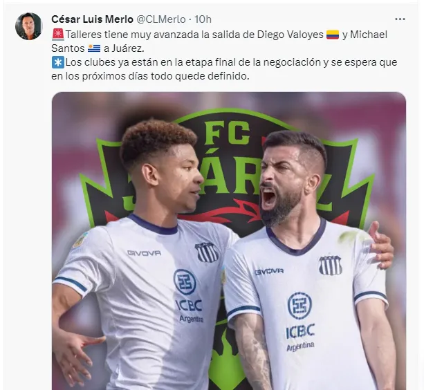 Acorde a lo que informa el periodista Cesar Luis Merlo, Talleres tiene muy avanzada la salida de Valoyes al F.C Juárez de México, ya que los clubes están en la etapa final de la negociación, por lo que se espera una resolución en los próximos días, y a su vez, también se iría al mismo equipo Michael Santos, el goleador uruguayo.