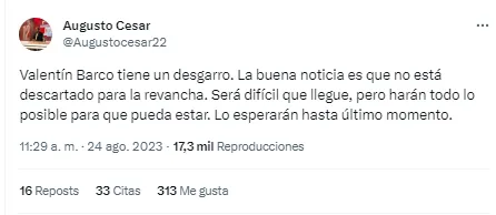 Dejando de lado lo que ocurrió en el verde césped ante la Academia, los hinchas de Boca solo mostraron una preocupación: la salud de Valentín Barco. Fue en horas del mediodía cuando el periodista Augusto César, junto a varios colegas que cubren al Xeneize a diario, confirmaron el parte médico antes de que se haga oficial.