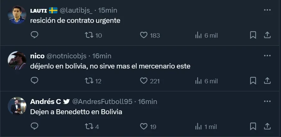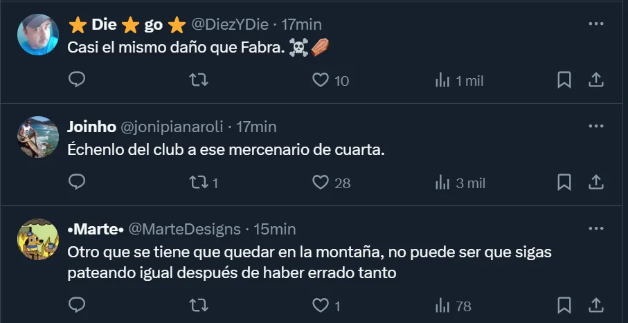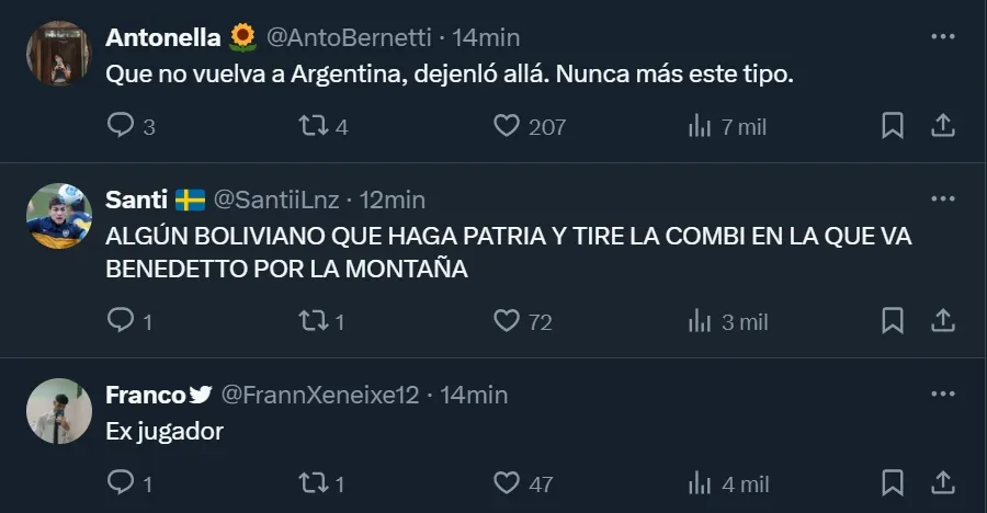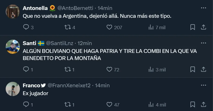 Así como algunos pidieron que desde la dirigencia que lidera Juan Román Riquelme le rescindan el vínculo al ex Club América y Elche CF, hubo otros fanáticos que exclamaron “que no vuelva a Argentina, déjenlo allá. Nunca más este tipo”, como así también lo tildaron de “ex jugador”.