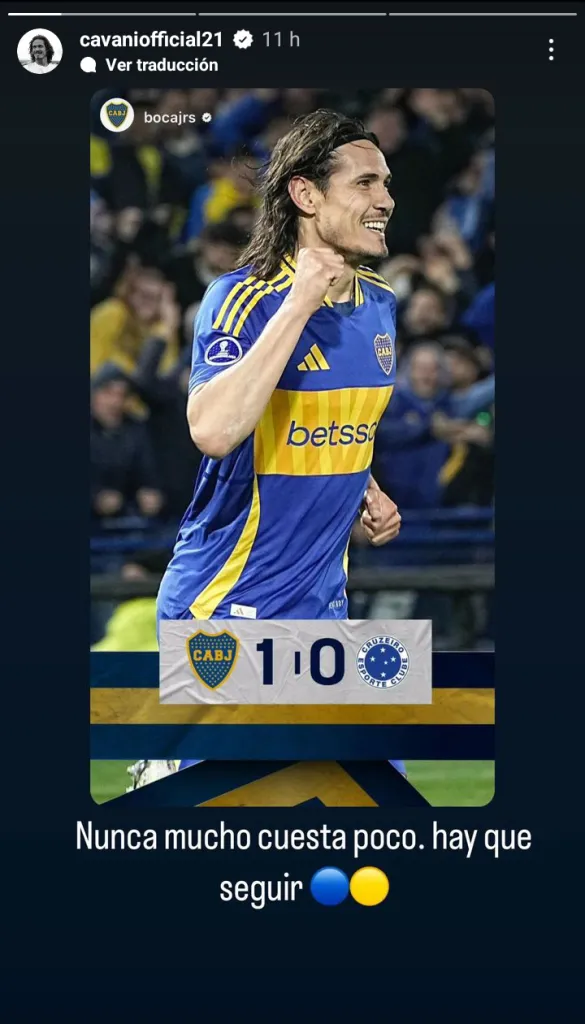 “Nunca mucho cuesta poco”, expresó el propio Edinson Cavani a través de una historia que compartió en su cuenta de Instagram, confirmando esa sensación en cuatro palabras. “Hay que seguir”, agregó el uruguayo para motivar y motivarse respecto a lo que se le vendrá al Xeneize en tan solo una semana.