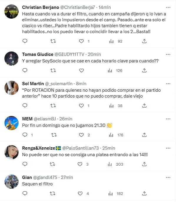 “¿Hasta cuándo va a durar el filtro?”, “saquen el filtro” y “qué triste como nos tratan a los socios”, fueron comentarios que se leyeron al pie del tuit con el que el Xeneize le comunicó a los abonados que tendrán que tener asistencia casi perfecta durante el último semestre en La Bombonera para tener la posibilidad de ver el choque contra Belgrano el próximo domingo. Una situación que pide modificaciones.