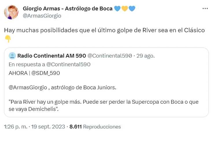Cuando el Millonario quedó afuera de la Copa Libertadores, el reconocido astrólogo del Xeneize había advertido que “para River hay un golpe más. Puede ser perder la Supercopa con Boca o que se vaya Demichelis”. Ahora, Armas citó ese mensaje y lo relacionó con lo que se viene.