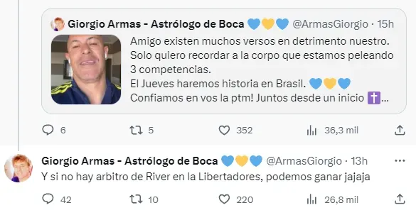 Giorgio Armas se hizo popular en las redes sociales luego de haber acertado con precisión varios pronósticos sobre los resultados del Xeneize. Incluso se autodenomina como el astrólogo de Boca y la Selección Argentina, dando recomendaciones tanto de indumentaria como de jugadores que deben ser titulares para conseguir los objetivos.