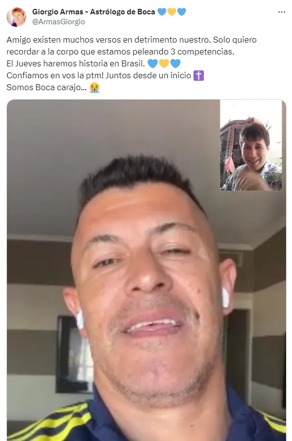 En esta oportunidad, entre tantos posteos que hizo en redes sociales, Armas contestó a una chicana y reveló la condición con la que el Xeneize podría ganar su séptima Copa. “Si no hay arbitro de River en la Libertadores, podemos ganar”, escribió en su perfil de X (antes Twitter).