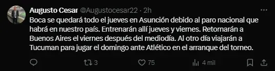 Según informó el periodista Augusto César, el plantel de Boca pasará todo el jueves en Asunción entrenándose y también realizará prácticas el viernes por la mañana para regresar el mismo viernes por la tarde a Buenos Aires. Al día siguiente, el sábado, se entrenará en Boca Predio por la mañana y luego viajarán rumbo a Tucumán para enfrentar a Atlético por la fecha 1 de la Liga Profesional el próximo domingo.