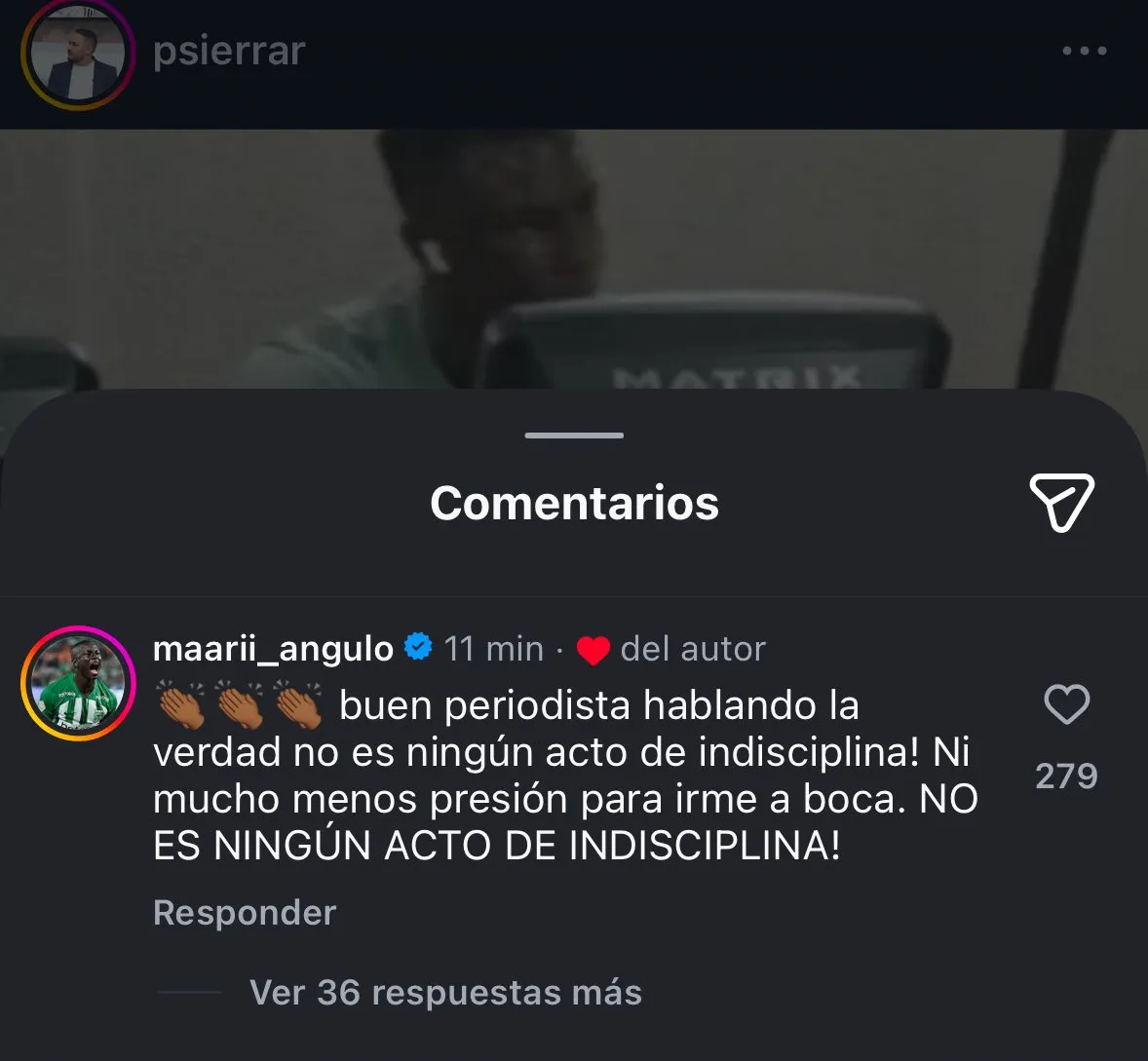 Aunque luego borró, la respuesta de Hinestroza no tardó en llegar: “Buen periodista hablando la verdad (sic). No es ningún acto de indisciplina, ni mucho menos presión para irme a Boca. ¡NO ES NINGÚN ACTO DE INDISCIPLINA!”.