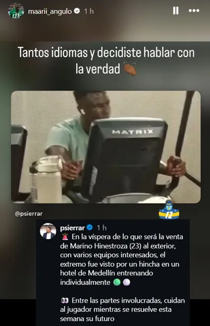 “En la víspera de lo que será la venta de Marino Hinestroza al exterior, con varios equipos interesados, el extremo fue visto por un hincha en un hotel de Medellín entrenando individualmente. Entre las partes involucradas, cuidan al jugador mientras se resuelve esta semana su futuro”, soltó Sierra.