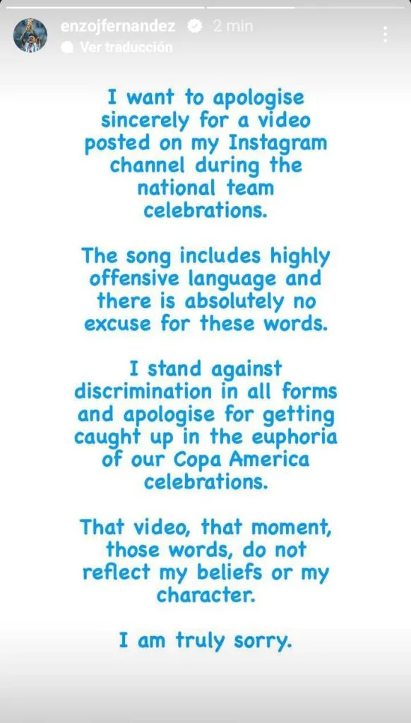 Fernández, quien se mostró muy apenado por lo sucedido, continuó con su pedido de disculpas e indicó: “Me opongo a la discriminación en todas sus formas y me disculpo por quedar atrapado en la euforia de nuestras celebraciones de la Copa América. Ese vídeo, ese momento, esas palabras, no reflejan mis creencias ni mi carácter. Lo siento de verdad”.