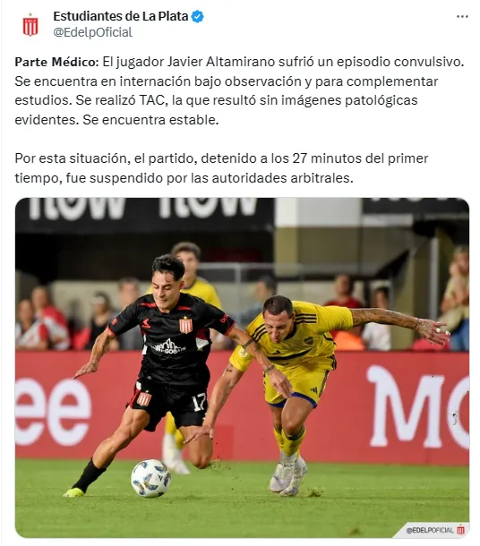 “Con la tranquilidad de que Javier Altamirano se encuentra estable, desde el Club Atlético Boca Juniors saludamos afectuosamente al jugador, su familia, y a todo el plantel de Estudiantes, deseándole una pronta recuperación”, dice el posteo del Xeneize en X (antes Twitter)
