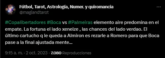 En concreto, el astrólogo que realiza predicciones deportivas en su cuenta de Twitter, “@magiaandtarot”, destacó lo siguiente: “Boca vs Palmeiras elemento aire predomina en el empate. La fortuna el lado xeneize, las chances del lado verdao. El último cartucho q le queda a Almirón es rezarle a Romero para que Boca pase a la final ajustadamente“. Resumidamente, el profesional destacó que el Xeneize sufrirá en Brasil, pero logrará el pase si Chiquito Romero tiene una jornada decisiva, ya sea en los penales o solamente en los 90 minutos. La suerte ya está echada.
