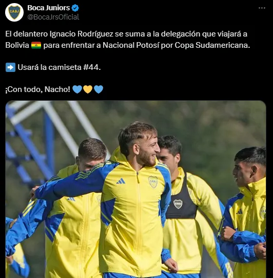 Tras la práctica de este martes, ratos antes del viaje a Sucre, la cuenta oficial de Boca en redes sociales anunció la convocatoria del nacionalizado uruguayo para el duelo por Copa Sudamericana. “El delantero Ignacio Rodríguez se suma a la delegación que viajará a Bolivia para enfrentar a Nacional Potosí por Copa Sudamericana. Usará la camiseta #44. ¡Con todo, Nacho!“, expresó el Xeneize en X (ex Twitter). Además, sumaron una foto suya del entrenamiento que tuvo el plantel hoy.