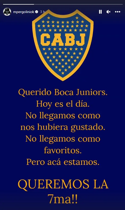 “Querido Boca Juniors. Hoy es el día. No llegamos como nos hubiera gustado. No llegamos como favoritos. Pero acá estamos. ¡Queremos la séptima!”, pidió al pie del posteo como parte de un grito sagrado que los hinchas del club de La Ribera no dejan de vociferar.