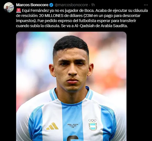 Este domingo 4 de agosto, en las vísperas del partido ante Barracas Central por la Liga Profesional, se confirmó la noticia que pululaba los pasillos de La Bombonera y que tenía a todo el Mundo Boca en vilo. Equi Fernández se marcha del club ante la ejecución de su cláusula de rescisión para convertirse en nuevo jugador del Al-Qadsiah (o Al-Qadsiyah) de la liga de Arabia Saudita.