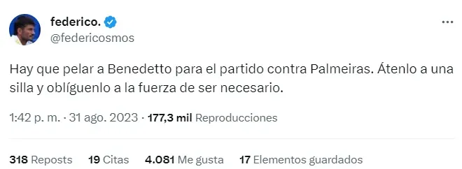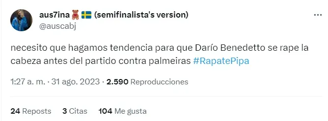 El objetivo de la gente de Boca es que Benedetto se rape, para volver al corte que tenía en su primer ciclo en el club. “Para que vuelva a su prime”, “que se pele antes de jugar con Palmeiras”, “juntemos firmas”, fueron algunos de los mensajes que se hicieron virales.