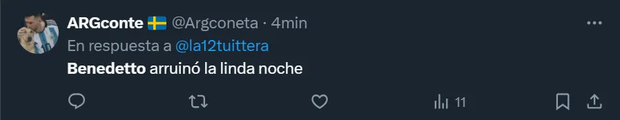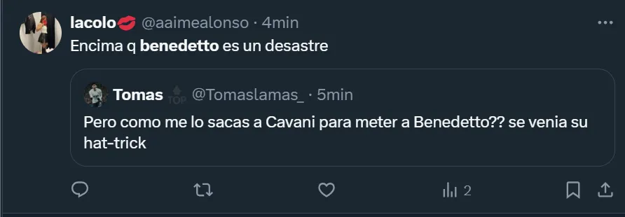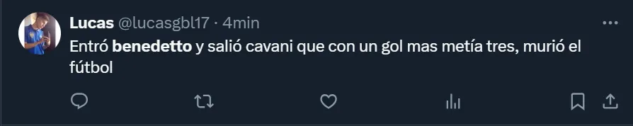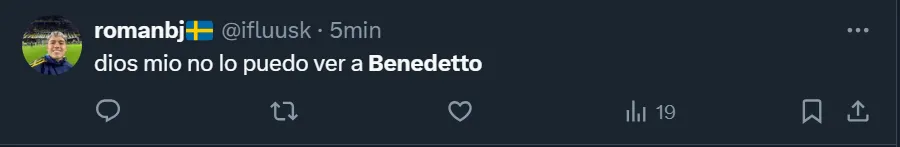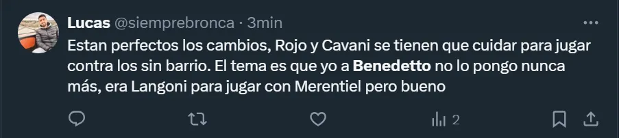 Además del los cuestionamientos a Martínez por su decisión, muchos de los fanáticos pidieron por la salida de Benedetto, a quien no quieren ver más luciendo la azul y oro, tal como ocurre hace varios partidos con jugadores como Frank Fabra, Lucas Janson, Pol Fernández y Juan Ramírez, quienes son los más resistidos desde las tribunas.