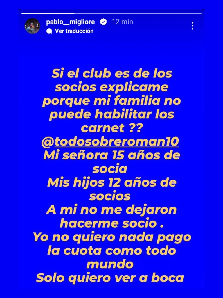En ese contexto, la directiva opta por aplicar un filtro de presentismo para la reserva de entradas y, por ello, muchos socios activos se quedan afuera. Uno de los hinchas afectados es Pablo Migliore, que volvió a disparar contra Riquelme a través de sus historias de Instagram.