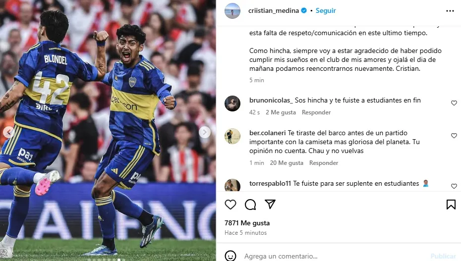 Luego de que el grupo inversor de Foster Gillett pusiera el dinero para que ejecutara su cláusula de rescisión, Medina atraviesa una nueva etapa en su carrera con la camiseta de Estudiantes de La Plata. A un mes de su salida de Boca, el futbolista publicó un picante mensaje en su cuenta de Instagram.