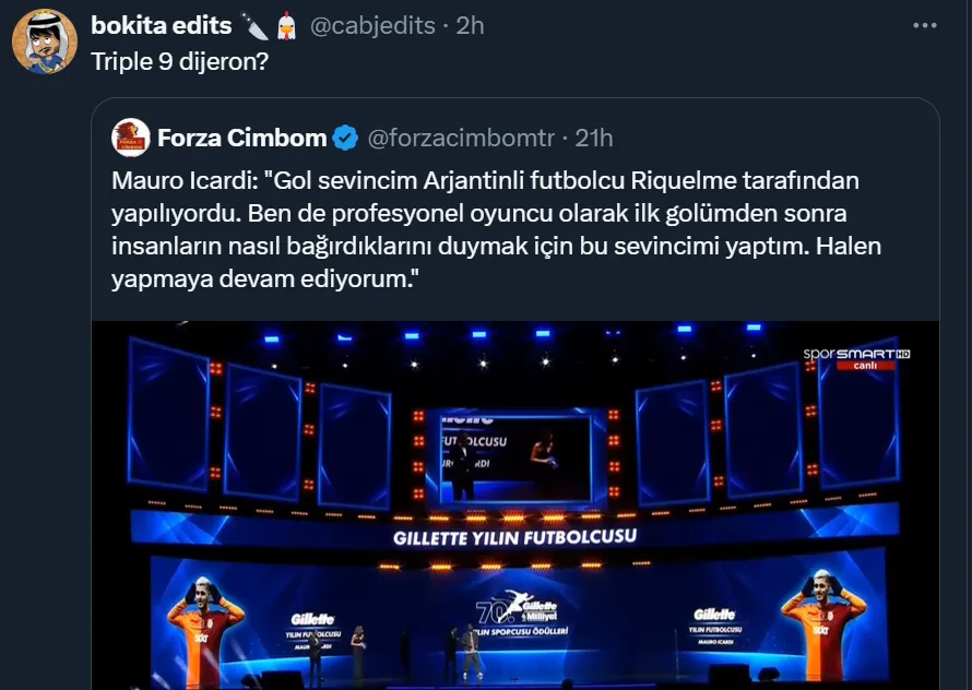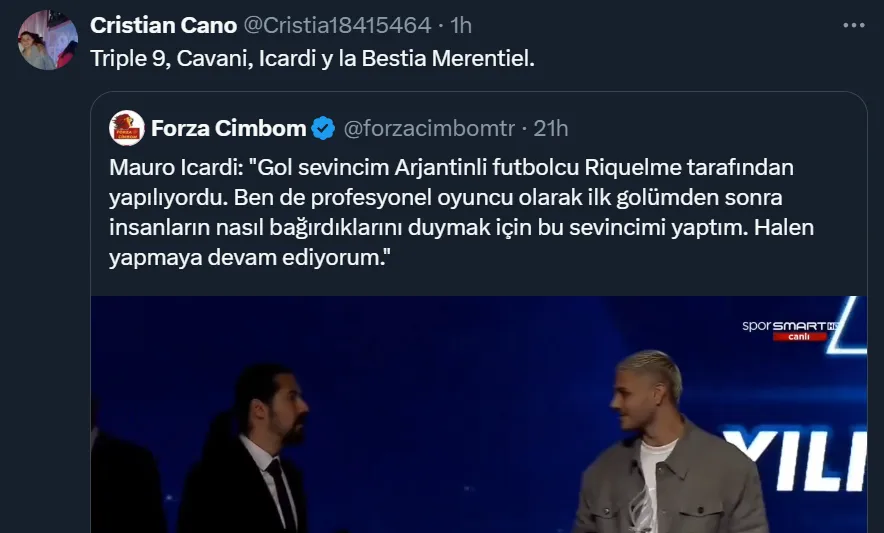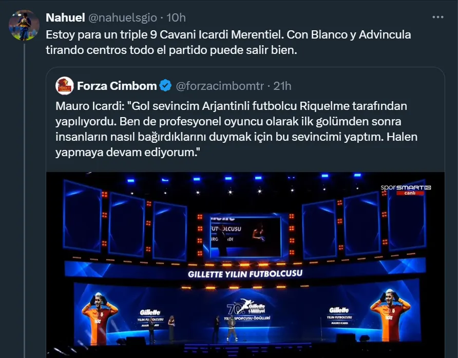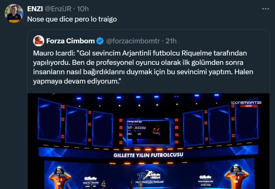 A pesar de toda esta situación, en las últimas horas y en medio de una premiación por su grandiosa temporada con el equipo comandado por Okan Buruk, el ex Inter de Milán le envió un claro guiño a los de La Ribera: “Mi celebración de gol la hizo el futbolista argentino Riquelme. También hice esta celebración para escuchar cómo la gente gritaba después de mi primer gol como jugador profesional. Todavía lo sigo haciendo”, sostuvo al recibir el galardón y explicar los motivos que lo llevaron a realizar el famoso Topo Gigio, que fue popularizado por el máximo ídolo del Xeneize tras convertirle un gol a River.