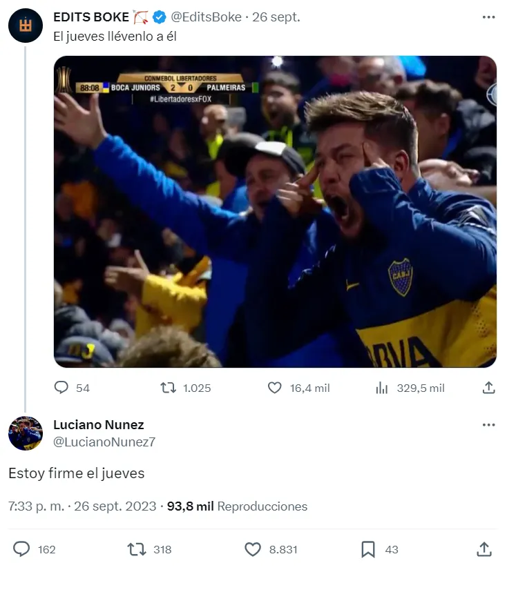 El muchacho en cuestión es Luciano Nunez, quien apareció en su cuenta de Twitter y contestó: “Estoy firme el jueves”. Se espera una Bombonera repleta de gente para uno de los encuentros más importantes del 2023.