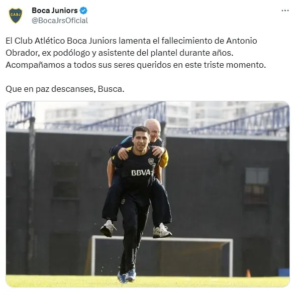 Tras conocerse la triste noticia, Boca lanzó un comunicado en redes sociales. “El Club Atlético Boca Juniors lamenta el fallecimiento de Antonio Obrador, ex podólogo y asistente del plantel durante años. Acompañamos a todos sus seres queridos en este triste momento. Que en paz descanses, Busca“, posteó la cuenta oficial del Xeneize vía Twitter junto a una foto de Obrador con Juan Román Riquelme.