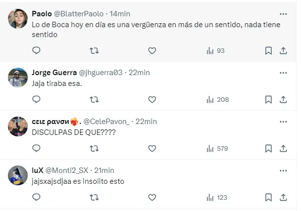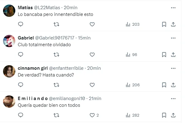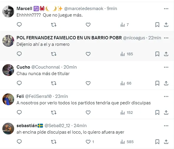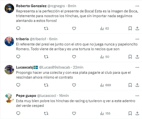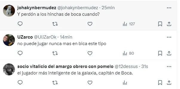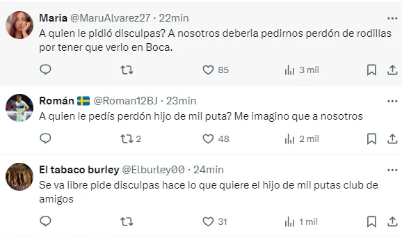 “A nosotros debería pedirnos perdón de rodillas por tener que verlo en Boca”, “Se va libre, pide disculpas, hace lo que quiere”, “Que le rescindan ahora mismo el contrato”, “Lo bancaba pero inentendible esto”, “Quería quedar bien con todos”, fueron algunos de los comentarios de los hinchas del elenco de la Ribera, molestos con Pol.