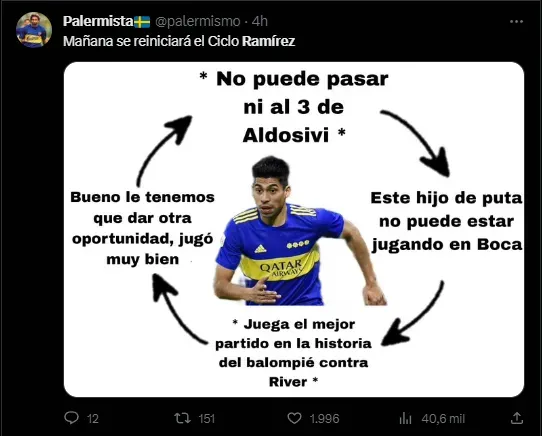 Por eso, a pesar de que en los 89 partidos que jugó en Boca, en la mayoría fue cuestionado por los hinchas, en la previa del Superclásicos son ellos mismos los que lo piden como titular. De yapa, en su paso por Talleres ya sabe lo que es marcarle a River, ya que anotó un doblete en 2017, en lo que fue la goleada 4 a 0 de la sobre el Millonario. Incluso, en las redes sociales tildaron que la formación para el clásico debía ser “Ramírez más 10”. ¿Terminará siendo titular?