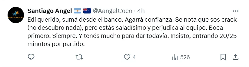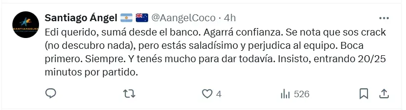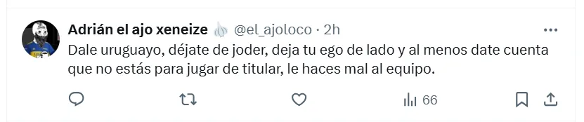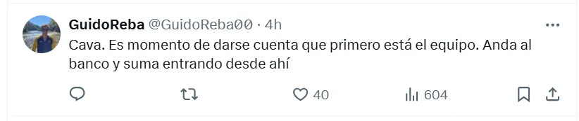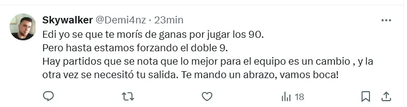 “Perjudica al equipo”, fue la frase más resonante que apareció entre las contestaciones de los Xeneizes a la publicación que subió Edinson a su cuenta personal de X (ex Twitter). La misma estaba compuesta por dos imágenes del equipo y el típico lema que habitualmente utiliza para este tipo de ocasiones. “Siempre juntos”, escribió Cavani en la reconocida red social.