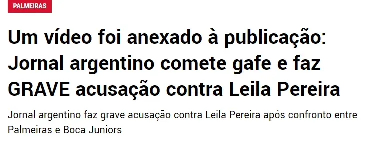 Distintos medios de Brasil no tardaron en salir a aclarar que la mujer en cuestión no era Leila Pereira, quien acudió a La Bombonera a ver el partido pero fue vestida de manera diferente. Por otro lado, agregaron que la mandataria no se tomó el trabajo de salir a hacer ninguna aclaración al respecto, por estar enfocada en la actualidad de Palmeiras de cara a la revancha que se disputará en Sao Paulo la próxima semana.