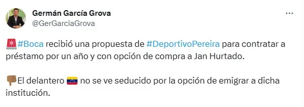 Mismo final tuvo una de las propuestas más recientes que recibió el club de La Ribera por uno de los jugadores cuya continuidad está en duda. Así lo informó el periodista Germán García Grova a través de su cuenta de Twitter: “Boca recibió una propuesta de Deportivo Pereira para contratar a préstamo por un año y con opción de compra a Jan Hurtado“. Si bien el Xeneize todavía no respondió, la postura del atacante fue clara.