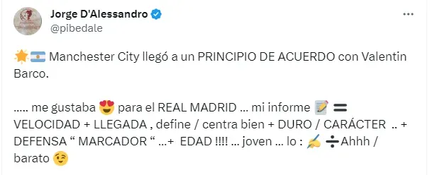 “Manchester City llegó a un PRINCIPIO DE ACUERDO con Valentin Barco. Me gustaba para el REAL MADRID. Mi informe: VELOCIDAD + LLEGADA , define / centra bien + DURO / CARÁCTER .. + DEFENSA “ MARCADOR “ …+ EDAD !!!! … joven … lo Ahhh / barato”, posteó.