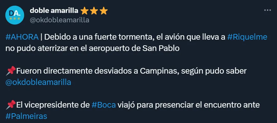 A pesar de la alegría que generó emprender un nuevo vuelo para poder estar junto a los futbolistas de Boca, no tuvieron un buen viaje. Sucede que el avión en el que viajaban Riquelme y compañía tuvo que ser desviado y no llegó al Aeropuerto Internacional de São Paulo-Guarulhos, sino que lo hicieron en Campinas, a 114 kilómetros de distancia.