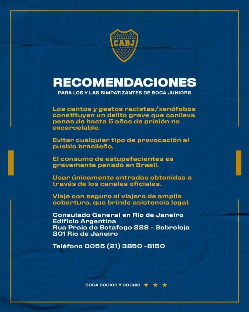 Es por eso, que previo a que todos comiencen con este viaje, desde la dirigencia de Boca emitieron un comunicado en las redes sociales, en el que les da una serie de recomendaciones para que no tengan problemas con la justicia brasileña durante su estadía.
