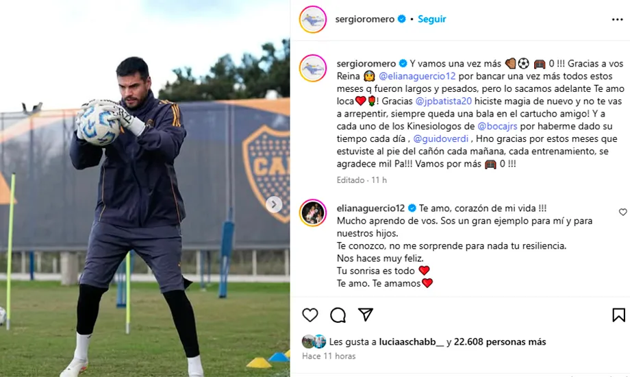“Y vamos una vez más. Gracias Eliana Guercio por bancar en todos estos meses que fueron largos y pesados. Pero lo sacamos adelante”, escribió en referencia a su esposa y principal apoyo emocional durante el tiempo que le tocó estar inactivo. “Gracias Jorge Pablo Batista. Hiciste magia de nuevo y no te vas a arrepentir. Siempre queda una bala en el cartucho, amigo”, continuó haciendo referencia al médico de Boca, pero también un aviso de intenciones de cara al futuro.