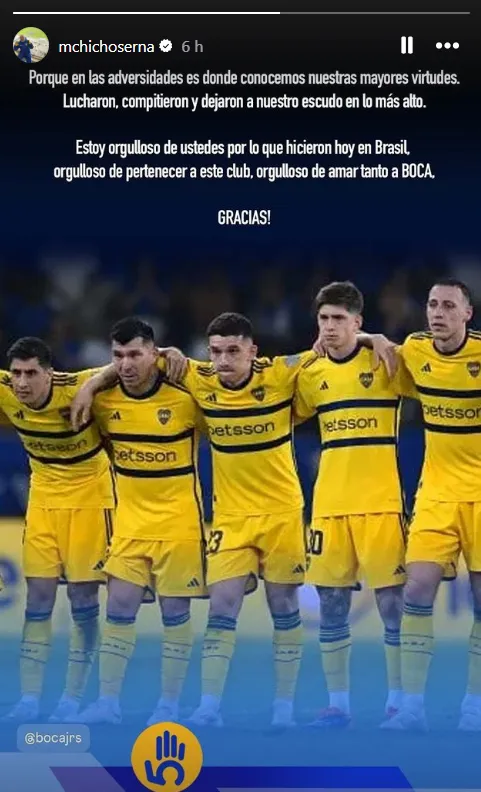 “Porque en las adversidades es donde conocemos nuestras mayores virtudes. Lucharon, compitieron y dejaron a nuestro escudo en lo más allto. Estoy orgulloso de ustedes por lo que hicieron hoy en Brasil, orgulloso de pertenecer a este club, orgulloso de amar tanto a Boca. Gracias“, expresó el integrante del CDF en su cuenta de Instagram.
