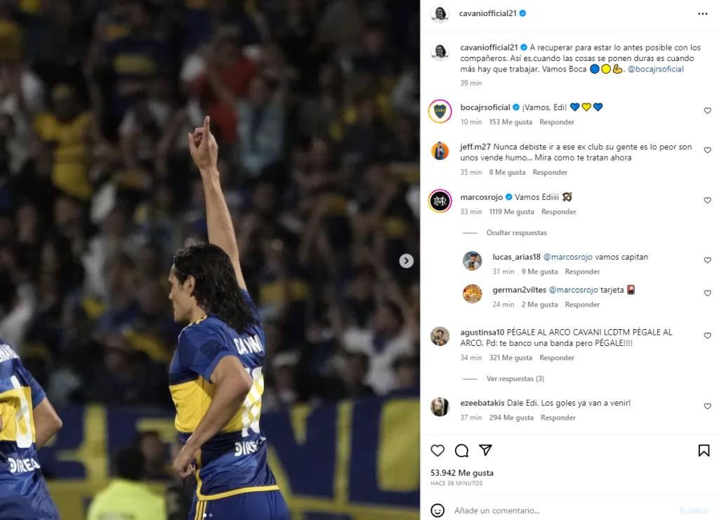 En su cuenta de Instagram, Cavani entregó un mensaje motivacional a los hinchas de Boca en el inicio de su camino de retorno a las canchas: “A recuperar para estar lo antes posible con los compañeros. Así es, cuando las cosas se ponen duras es cuando más hay que trabajar. Vamos Boca“.