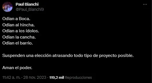 Luego de la oficialización de esta denuncia que suspendía las elecciones en Boca hasta que se esclarezca la situación, los hinchas xeneizes estallaron en redes sociales contra Andrés Ibarra y Mauricio Macri, en donde incluso dijeron expresaron que eran personas que “odiaban a Boca” y que solo buscaban llegar al poder en el club por fines políticos. Entre ellos, otro que no tuvo filtro y arremetió con los tapones de punta contra la oposición fue Paul Bianchi, el nieto del “Virrey”.