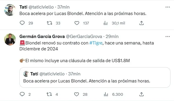 “Boca acelera por Lucas Blondel. Atención a las próximas horas”, informó el periodista Tati Civiello durante la mañana del jueves, el mismo que había adelantado que había interés por el defensor de Tigre a comienzos de semana. La nueva posición de Luis Advíncula, sumado a la irregularidad de Marcelo Weigandt, obligaron al CdF a buscar un nuevo lateral por derecha para elevar la exigencia del puesto.