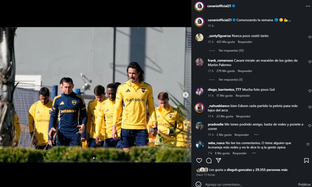 “Comenzando la semana“, escribió Cavani, adjuntando una serie de imágenes de la práctica del primer equipo. En los comentarios aparecieron tanto mensajes de apoyo como críticas, pero fueron las respuestas negativas las que más resaltaron en el posteo del atacante.
