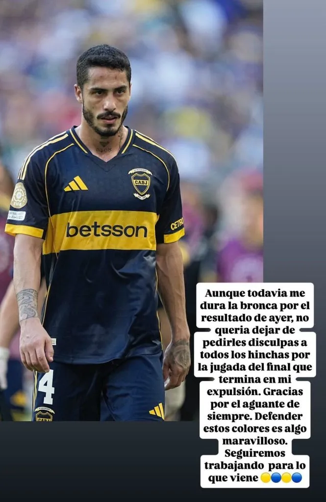 A través de su cuenta de Instagram, el defensor publicó un mensaje para los hinchas luego de lo sucedido en el Hard Rock Stadium: “Aunque todavía me dura la bronca por el resultado de ayer, no quería dejar de pedirles disculpas a los hinchas por la jugada del final que termina en mi expulsión“.