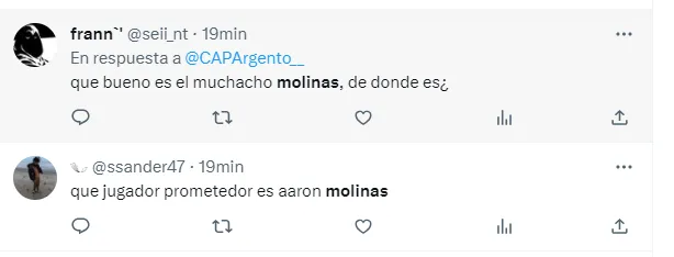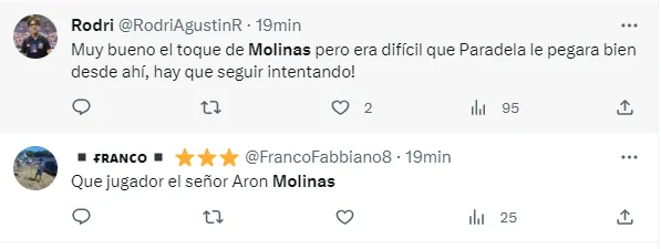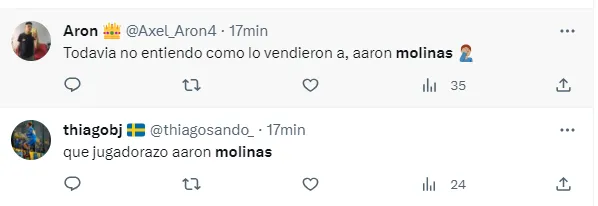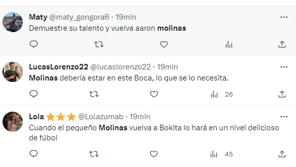 “Molinas debería estar en este Boca, lo que se lo necesita”, “Cuando el pequeño Molinas vuelva a Bokita lo hará en un nivel delicioso de fúbol”, “Que jugador el señor Aron Molinas”, fueron algunos de los tantos comentarios que hicieron los fanáticos del club de La Ribera.